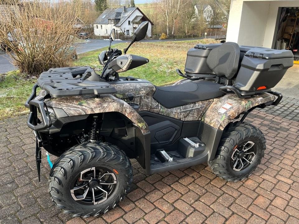 Alu Felgen, Lenkunterstuetzung (EPS), Scheibenbremsen mir ABS, T3b Zulassung, Stabile Handschuetzer, Gepaecktraeger hinten und vorne, Beifahrer Rueckenstuetze und Haltegriffe, Laengerer Radstand fuer angenehmes Fahren zu zweit, LCD Digital Disolay, Zuschalbarer Allradantrieb, Differenzialsperren hinten und vorne, Anhaengerkupplung, Gasdruckfederbeine, usw.