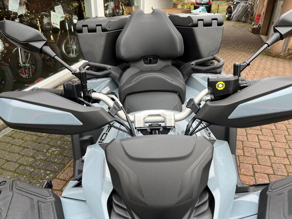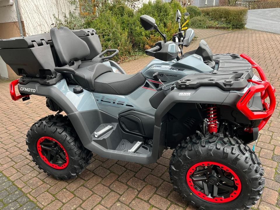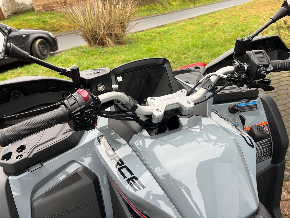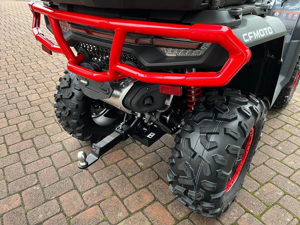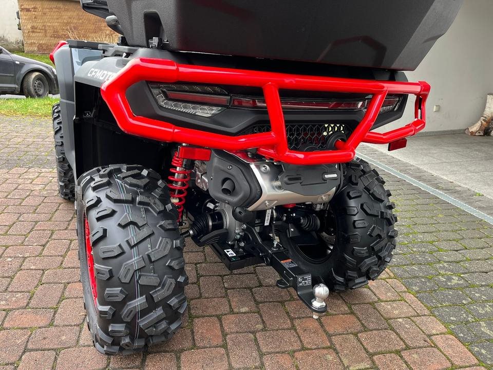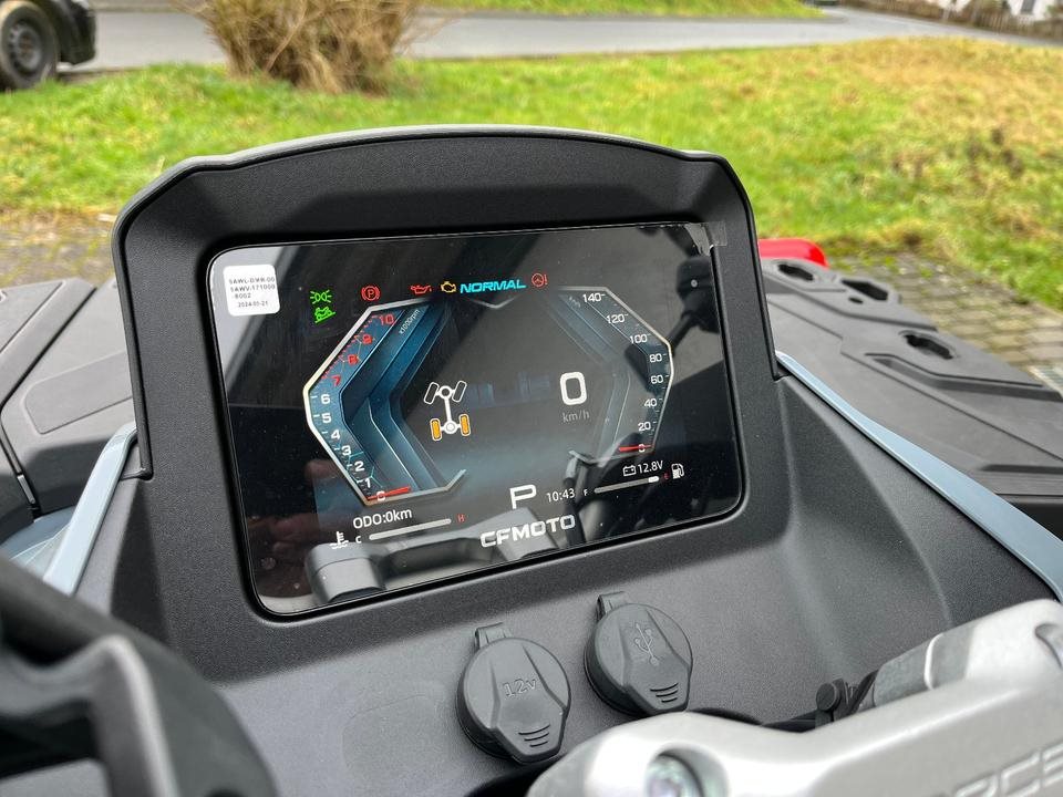 Top ATV des Marktführers CFMoto. Sehr laufruhiger 2-Zylinder V-Motor mit satten 71 PS. Leichgängige Gangwahl, Ride by Wire, Wasserkühlung, EFI, Top Ausstattung : Servo Lenkung, Scheibenbremsen mit ABS an allen Rädern, Differenzial hinten und vorne zum sperren, Zuschaltbarer Allradantrieb, 7-Zoll Farbdisplay, 14 Zoll Alu Felgen, USB Anschluß, Beifahrer Rückenstütze und Haltegriffe, Geäackträger hinten und vorne, Seilwinde mit Syntetic Seil, Gasdruckfederbeine verstellbar, 100Liter Heckbox mit Schnellverschlüssen serienmäßig. Sonderausstattung Farbe Tundra Grey mit roten Beadlock Felgen und Roten Bumper vorne und hinten. Nach Absprache kann gerne eine Probefahrt gemacht werden. Wir machen Ihnen auch gerne ein maßgeschneidertes Finanzierungsangebot. In unserem Shop finden Sie eine große Auswahl an Helmen und Bekleidung. Wir haben alle CFMoto Modelle auf Lager.