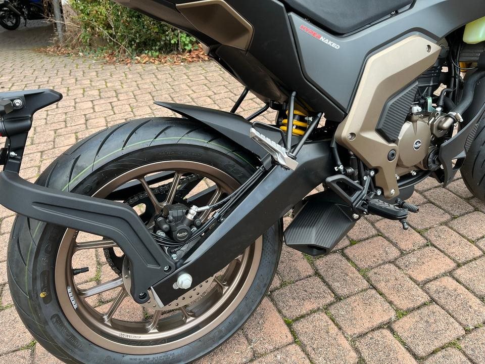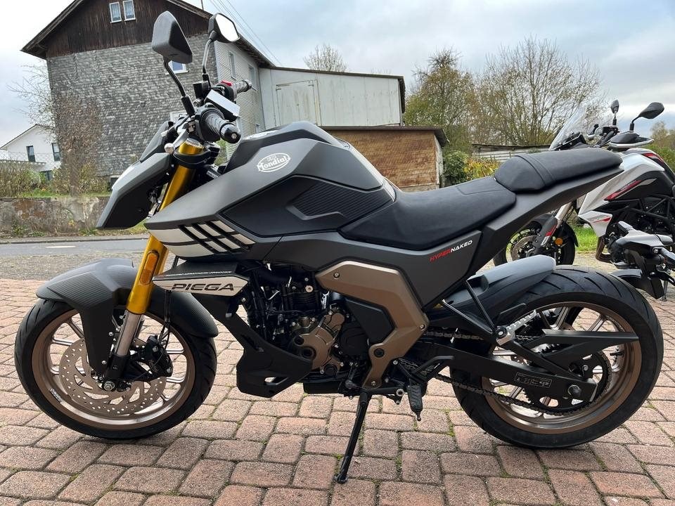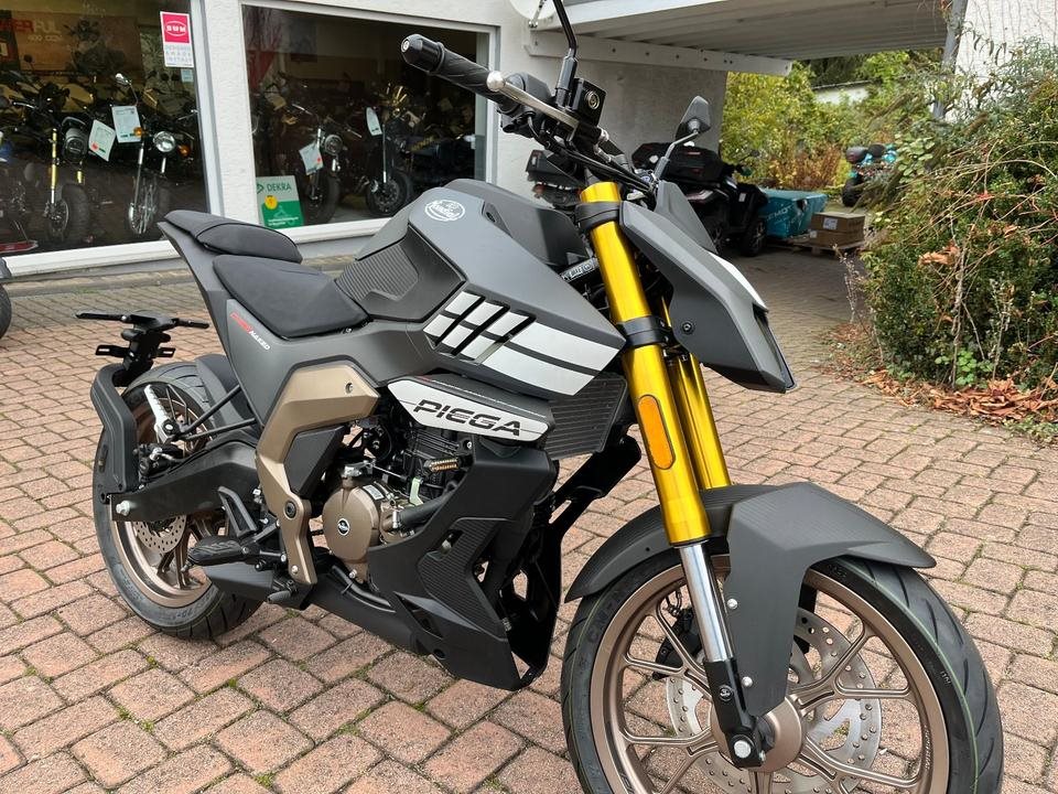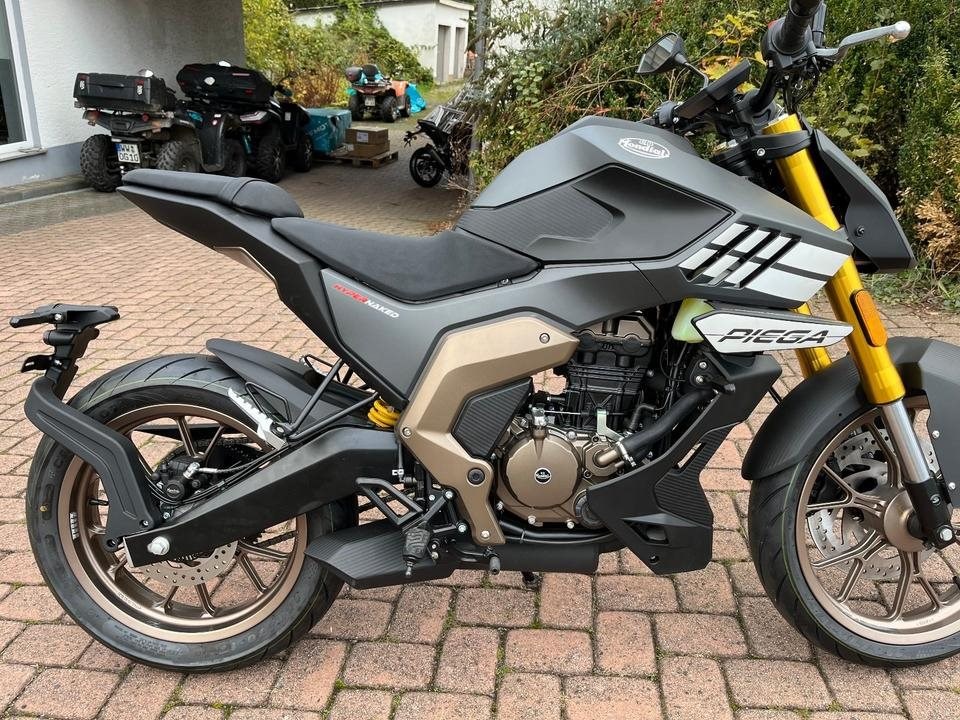 Der Entwurf stammt aus der Feder des Designers Rodolfo Frascoli. Aber nicht nur bei den optischen Werten macht die PIEGA eine gute Figur. Der Viertakt-Single mit einer Einspritzanlage von Dell'Orto, Fluessigkeitskuehlung und Sechsgang-Getriebe treibt das Naked Bike zuverlaessig ueber den Asphalt und wird mittels ABS-Bremsanlage zum Stehen gebracht. Die scharfe Karosserie wird durch LED-Scheinwerfer, eine asymmetrische Schwinge und eine kompakte Unterboden-Auspuffanlage ergaenzt. Alle wichtigen Fahrparameter im Blick hat man dank des Vollfarb-TFT-Displays mit zwei verschiedenen Anzeigemodi.
