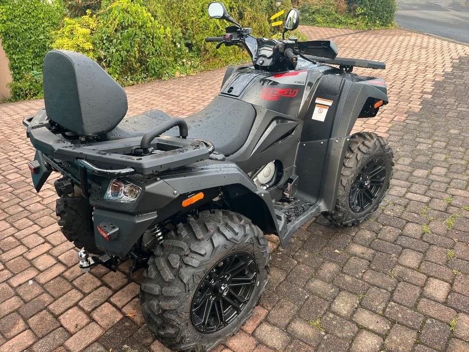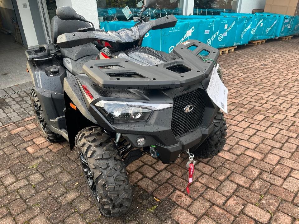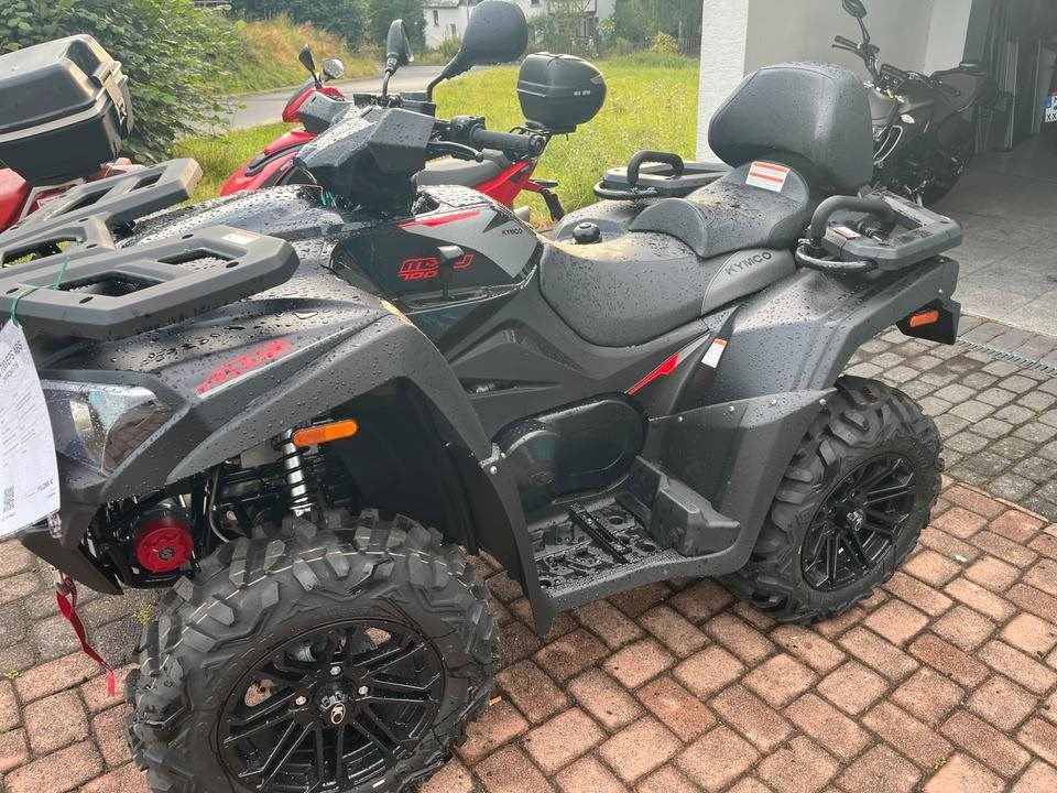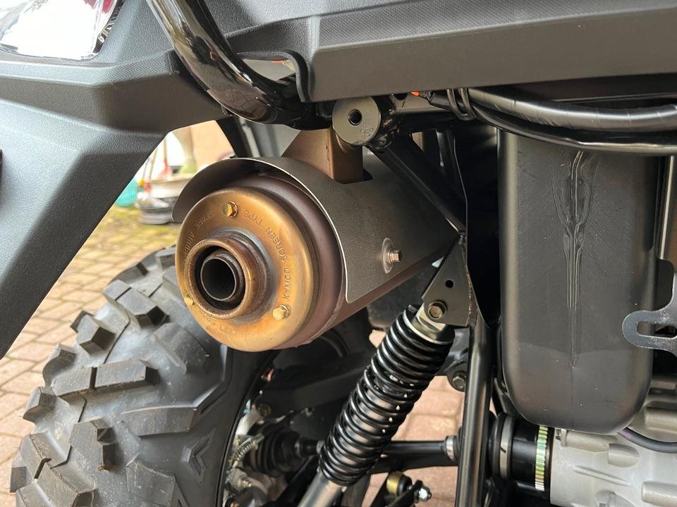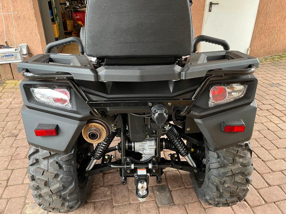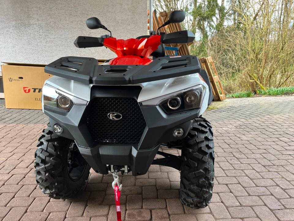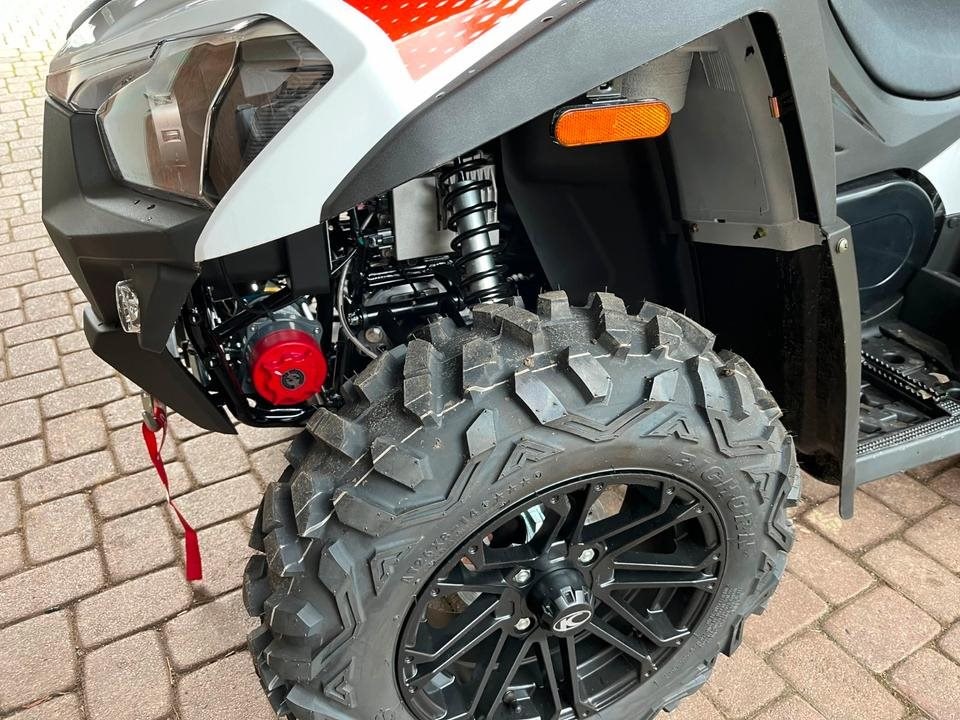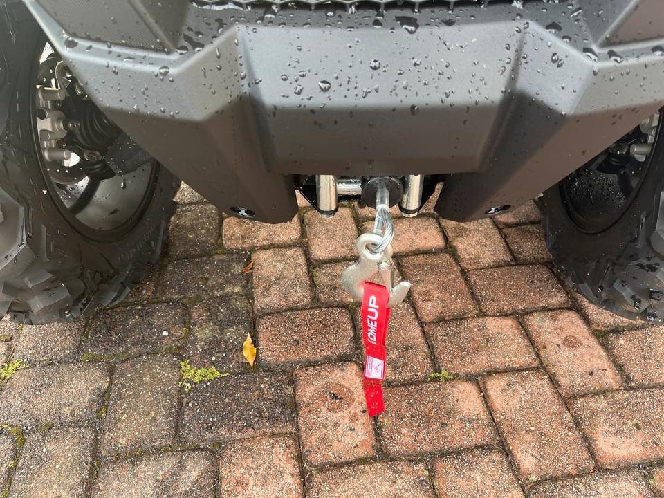 Und das ist noch längst nicht alles. Zur Vollausstattung gehören zum Beispiel eine elektronische Lenkunterstützung, die geschwindigkeitsabhängig reagiert, eine kräftige Seilwinde, stufenlose Variomatik, zuschaltbarer Allradantrieb und Differenzialsperre vorne, Untersetzungsgetriebe, Bergabfahrhilfe, Anhängerkupplung, zentrales LCD-Cockpit und sportliche Doppelspeichen-Felgen mit Maxxis 14Zoll Bighorn Reifen.